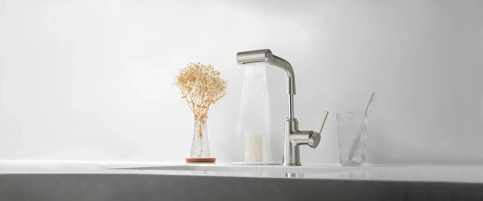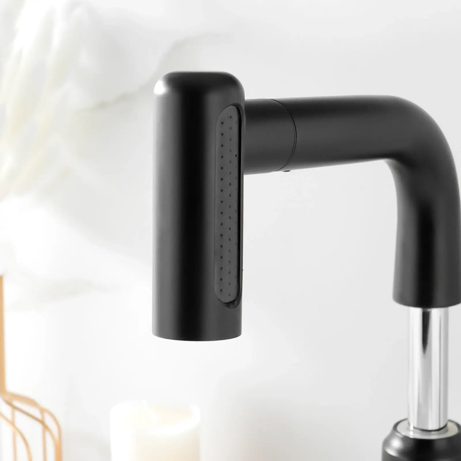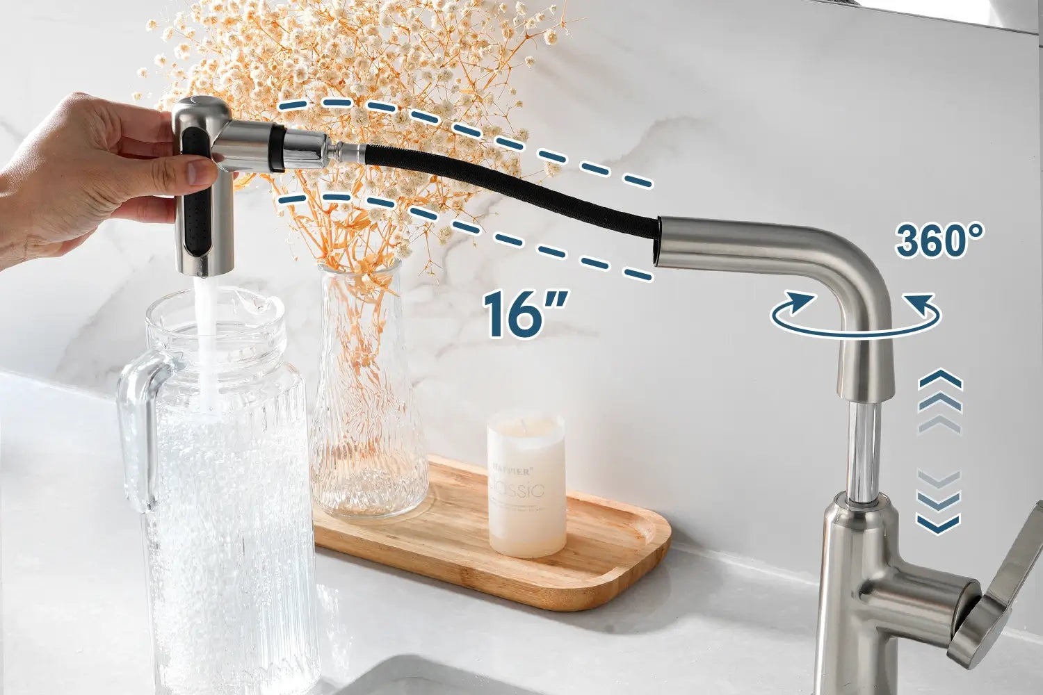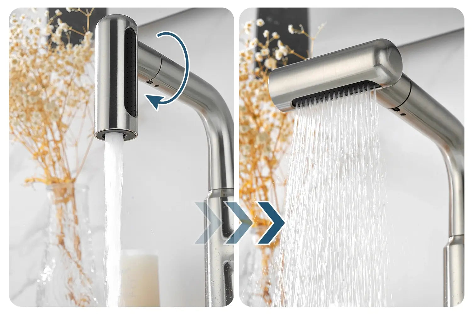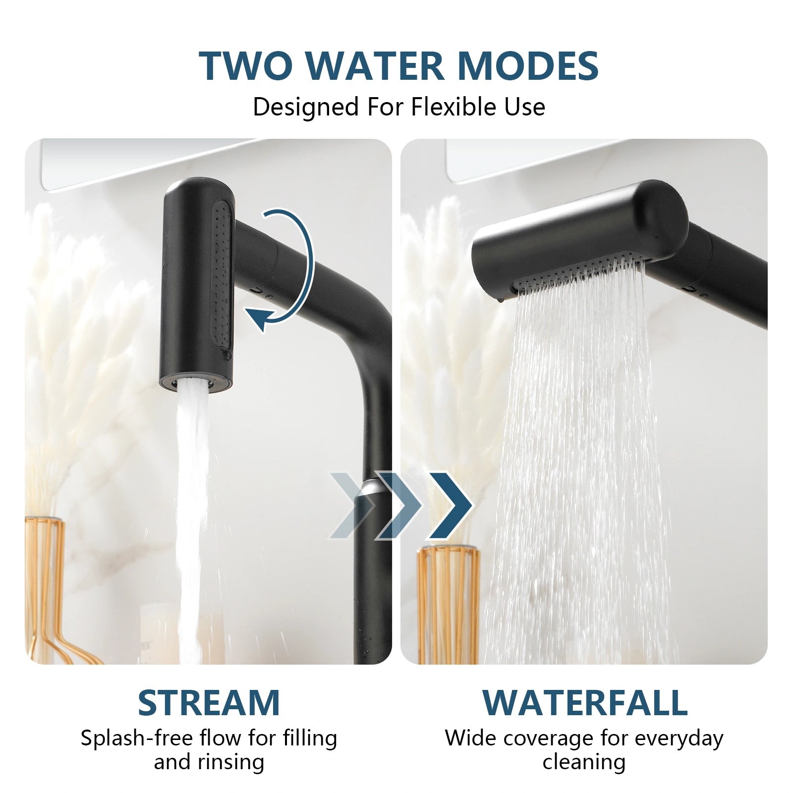 • The pull-out sprayer enables seamless switching between stream and waterfall modes.