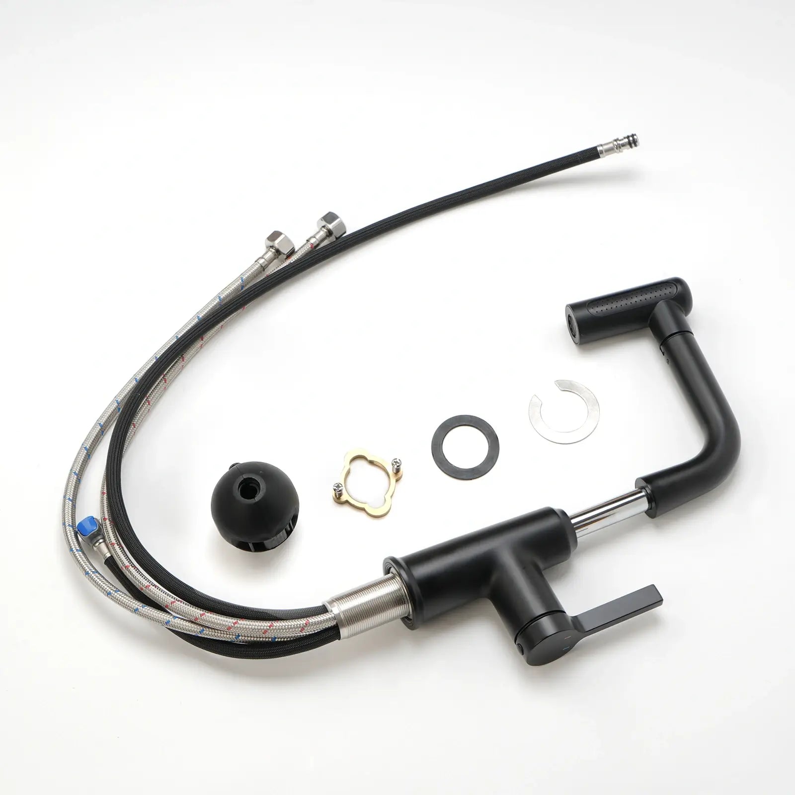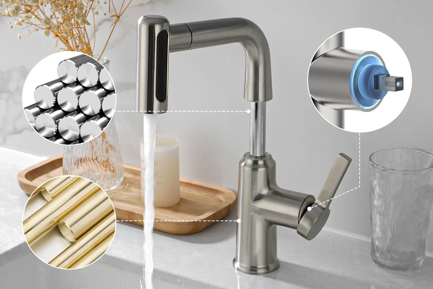 The faucet is made of brass and stainless steel. And the sprayer is made of ABS, a kind of environmentally friendly polymer material.