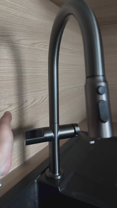 The Lefton Kitchen Induction and Pull-down Faucet KF2206, with arched silhouette design, is made of high-precision brass, combined with Lefton's top-level ceramic valve core, which enables precise control of water flow and temperature adjustment. Additionally, its pull-down swivel spout and nylon hose make it easy to rinse hard-to-reach areas of your sink. To add elevated convenience for homeowners and their kitchen, The battery-operated motion sensor technology allows you to enjoy a touch-less experience. It is activated by simply waving your hand or an object in front of it. The digital temperature and time display improves cleaning comfort and reminds you to save water.