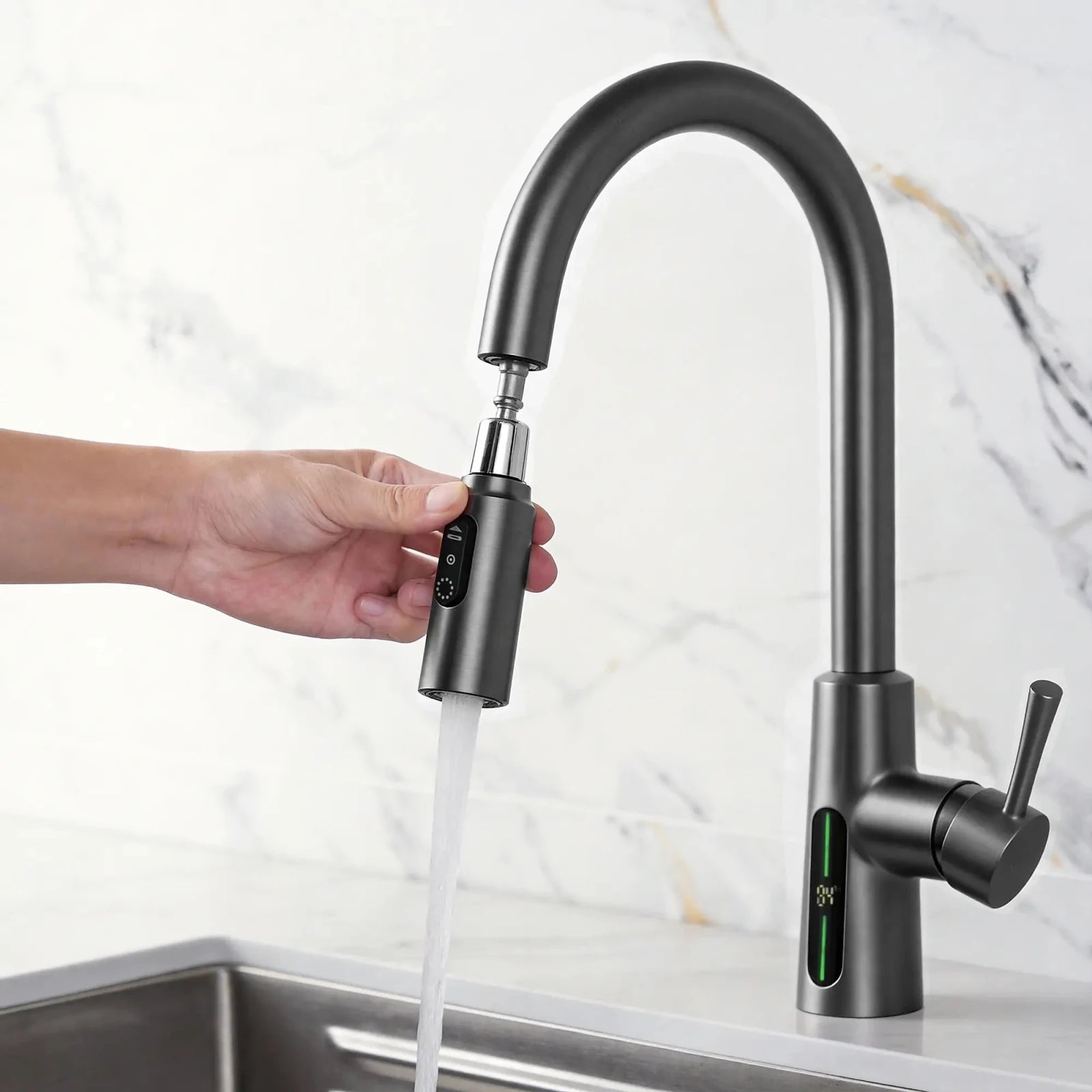 The LED screen displays the water temperature in real time and is powered entirely by water flow—no batteries or external power required. The system activates automatically when the faucet is in use, delivering a seamless and energy-efficient experience.