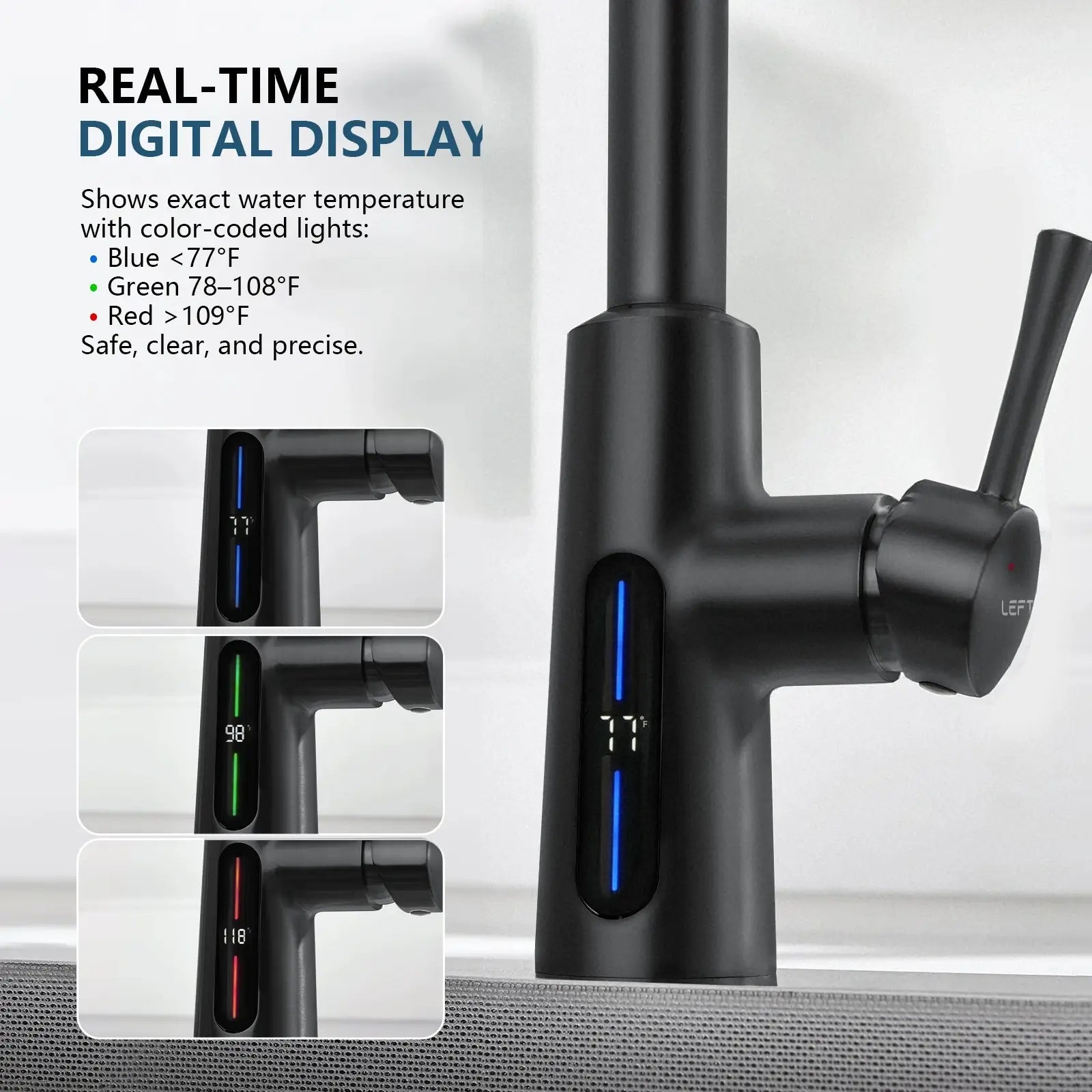 Clear color-coded indicators—blue for below 77°F, green for 78°F–108°F, and red for above 109°F—allow you to monitor temperature at a glance, helping improve safety while adding a modern, high-tech touch to your kitchen.