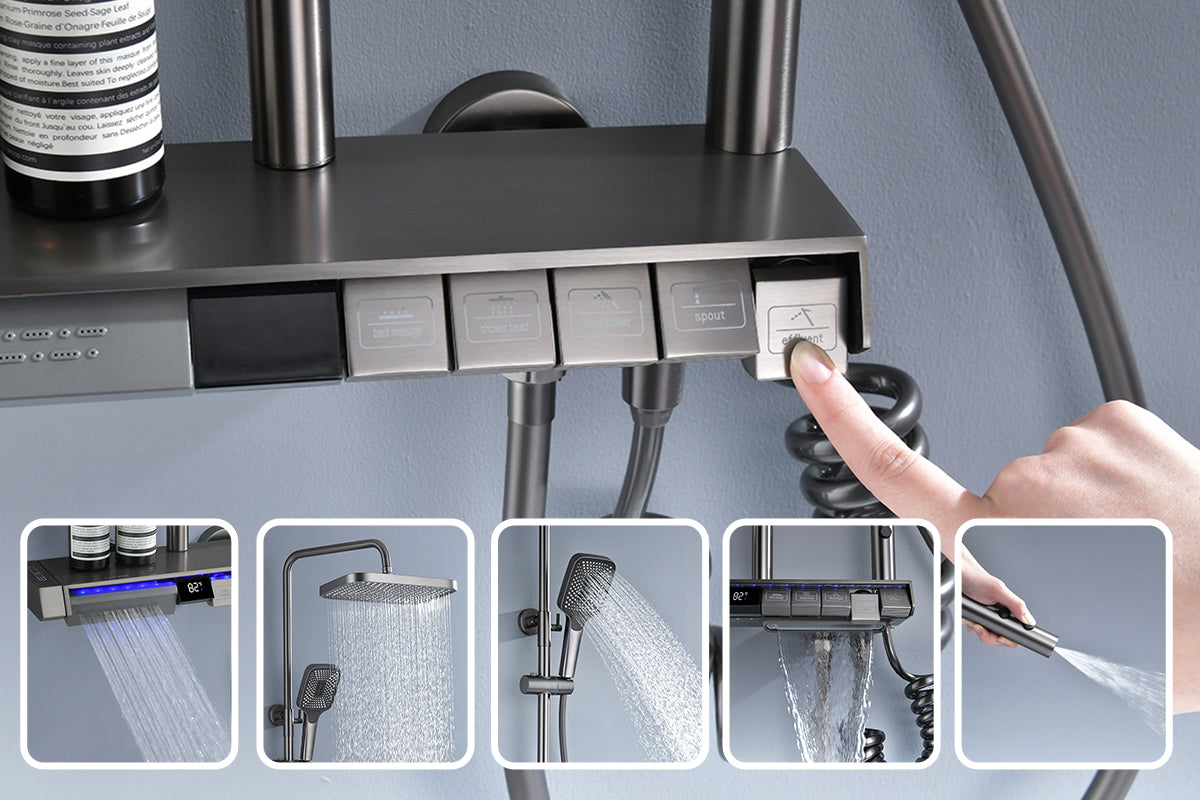 Five spouts—shower head, hand shower, cleanse sprayer, back massage, and bathtub spout—each with its own clearly labeled switch. Sleek buttons allow effortless control of every function, delivering a safe, refreshing, and fully personalized shower experience.