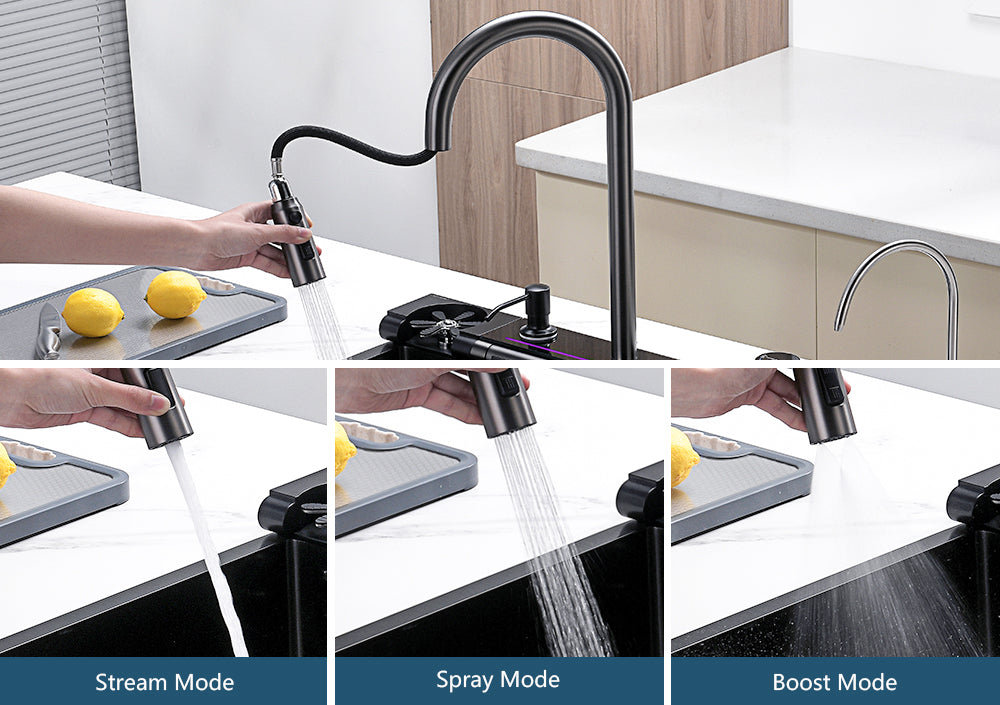 • Multiple Water Outlet Modes: Experience dynamic dish cleaning with two adjustable-angle waterfall faucets and a versatile pull-out faucet offering multiple water modes.