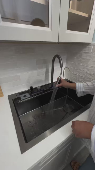 This sink is equipped with a digital display providing real-time monitoring of the water temperature and usage duration. The surface is constructed of tempered glass, which gives the kitchen sink a modern and high-tech look.