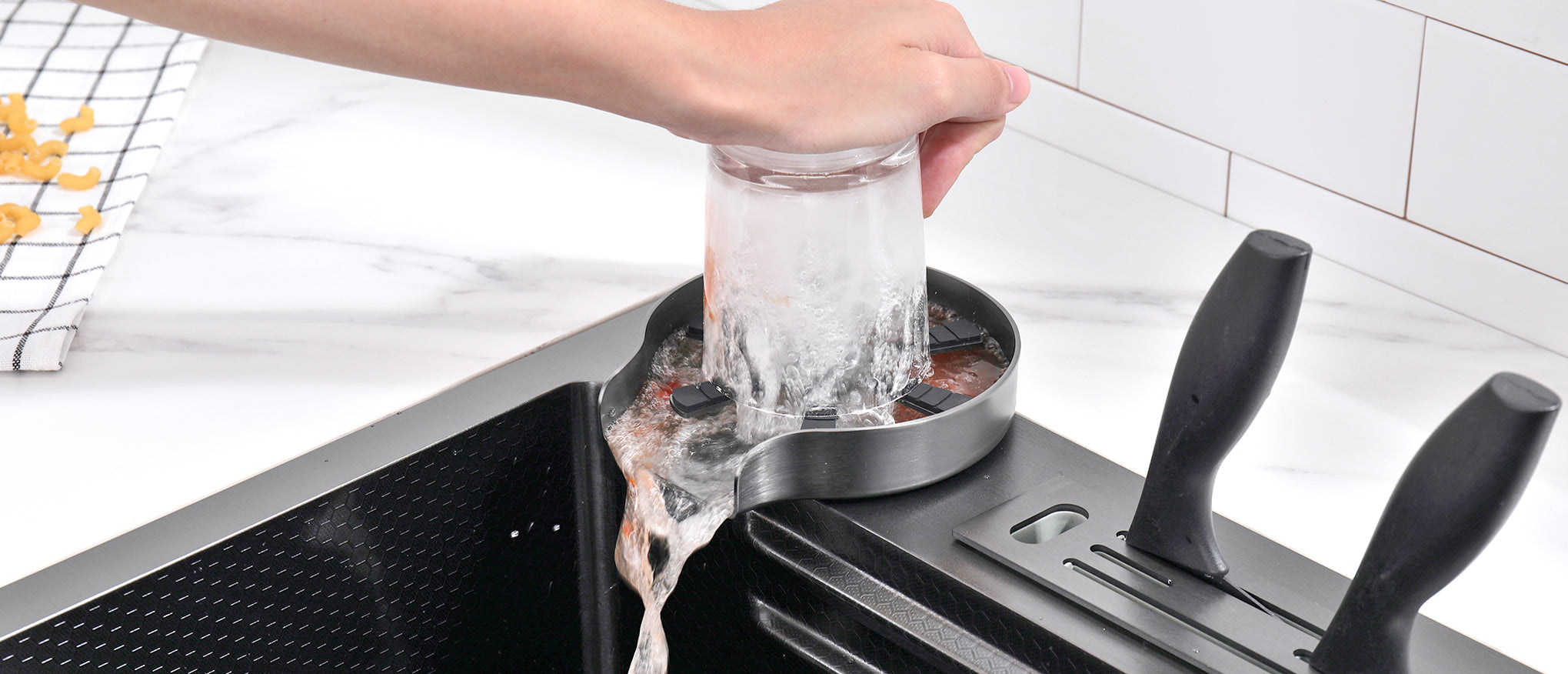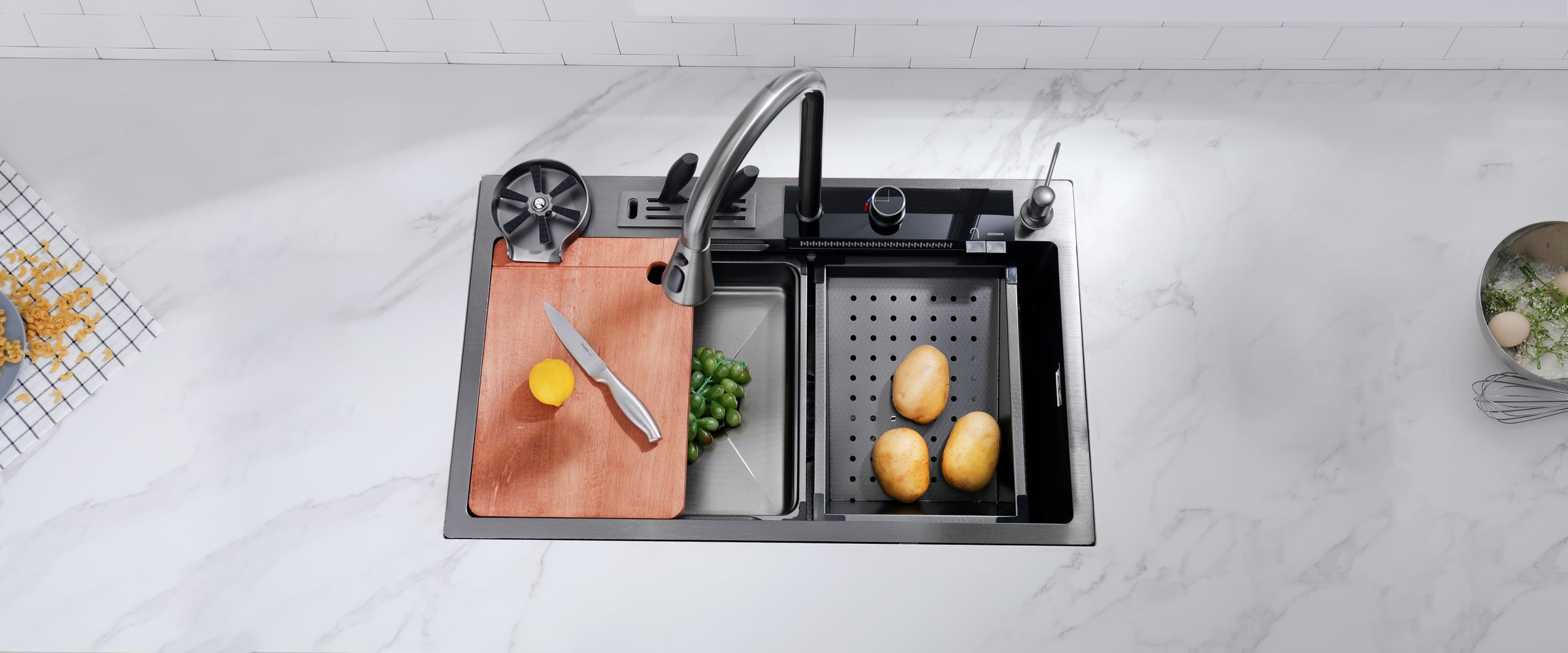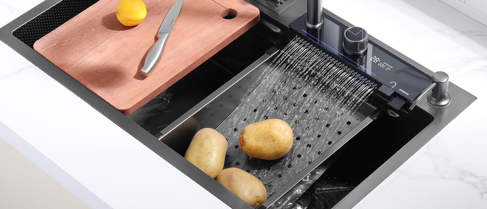 Transform your sink into a multi-functional workspace with dual sliding tracks. The sink features a high-pressure glass rinser, soap dispenser, and knife holder, ensuring maximum convenience.