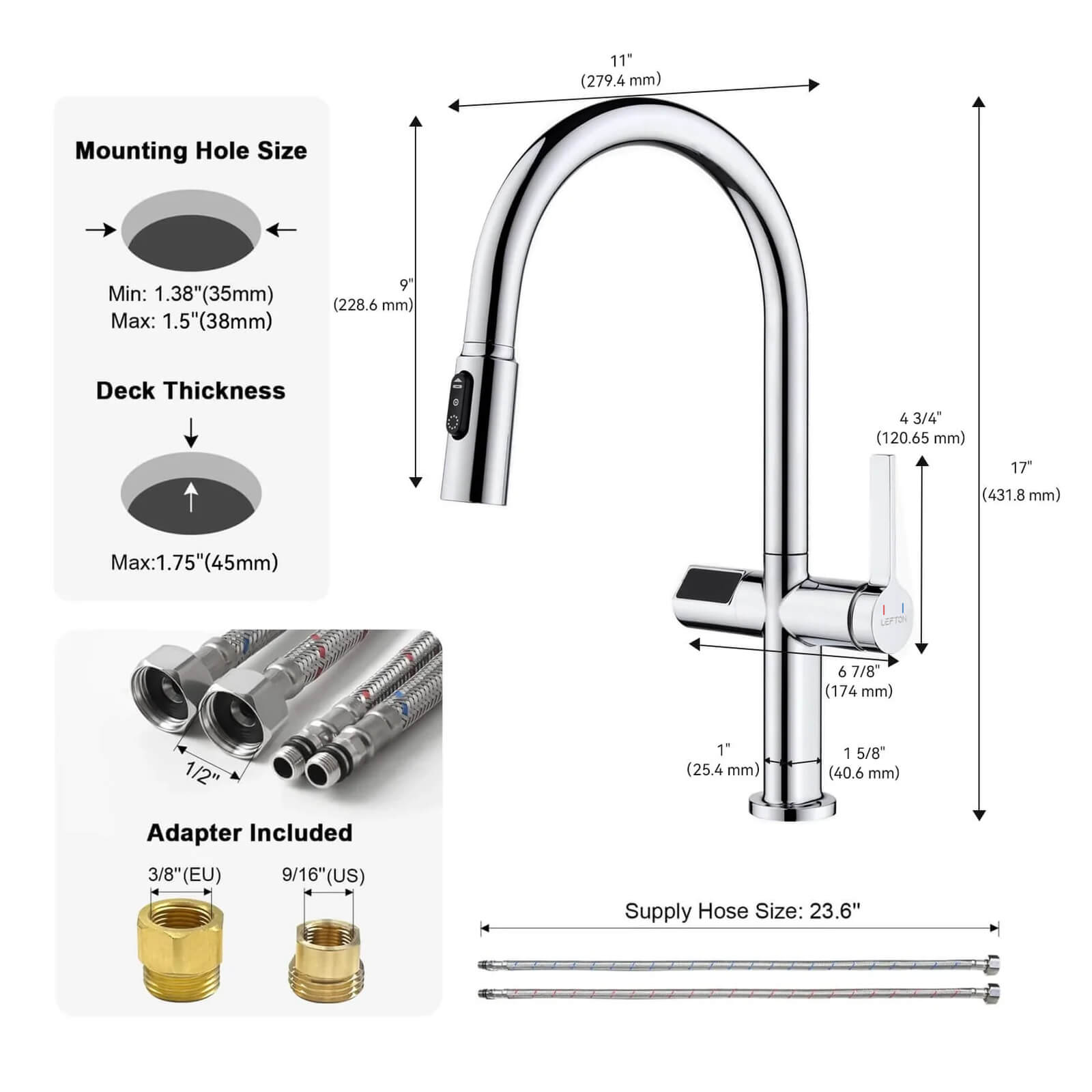 The Lefton Kitchen Induction and Pull-down Faucet KF2206, with arched silhouette design, is made of high-precision brass, combined with Lefton's top-level ceramic valve core, which enables precise control of water flow and temperature adjustment. Additionally, its pull-down swivel spout and nylon hose make it easy to rinse hard-to-reach areas of your sink. To add elevated convenience for homeowners and their kitchen, The battery-operated motion sensor technology allows you to enjoy a touch-less experience. It is activated by simply waving your hand or an object in front of it. The digital temperature and time display improves cleaning comfort and reminds you to save water.