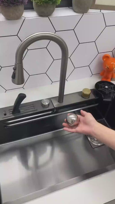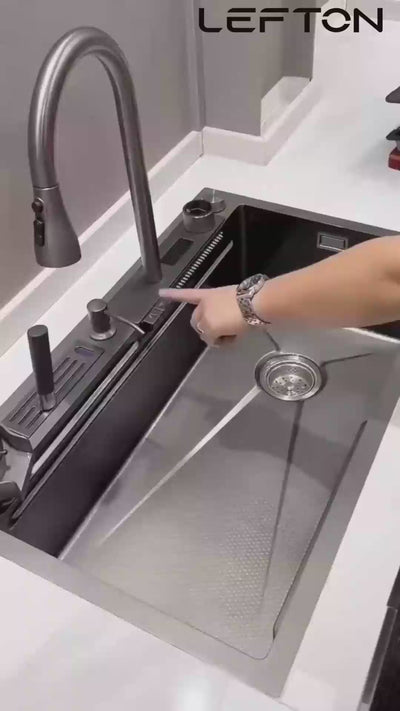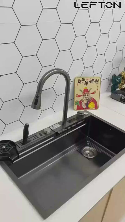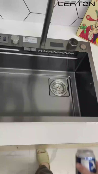 The Lefton waterfall workstation kitchen sink KS2204 is designed with honeycomb embossed and nano-coated, fine-line brushed finish that makes it resistant to chipping, cracking or burning and appearance is more elegant. It can match glass rinser KFR2202 and soap dispenser KSD2201 (included in the package), which makes the sink more useful. The waterfall faucet can be switched between waterfall mode and faucet mode by 'Piano Button'. The digital temperature display (battery-free and shown on Celsius only) allows you do the cleaning at the optimum temperature. We offer a 5-year warranty on the sink set and its accessories.